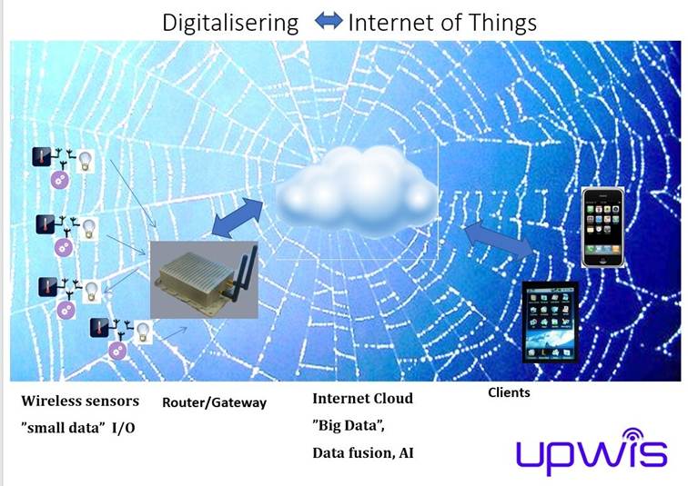 wireless sensors-”small data” I/O <-> router/gateway <-> Internet Cloud, ”Big Data”, data fusion, AI <-> Clients